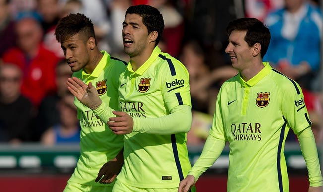 Barcelona Vs Granada Messi Goal , Barcelona's Forward Lionel Messi (C) Celebrates A Goal With Neymar (L) And Luis Suarez (R) During The Spanish League Football Match Fc Barcelona Vs Granada Cf At The Camp Nou Stadium In Barcelona On January 9, 2016 (Afp Photo/Lluis Gene).